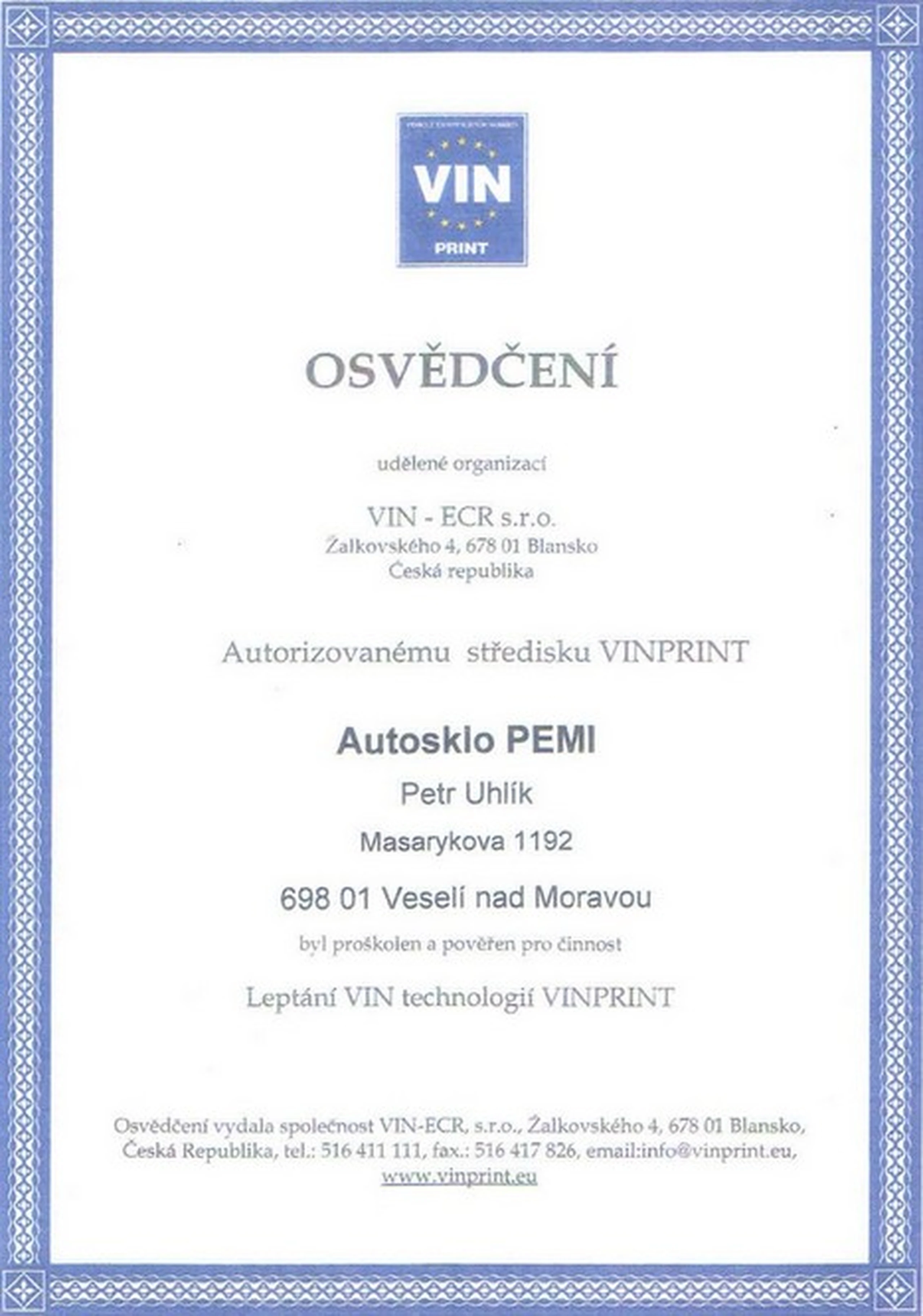 Trvalým a neodstranitelným vyleptáním VIN kódu na skla automobilu snížíte riziko odcizení o více jak 90 % !!!